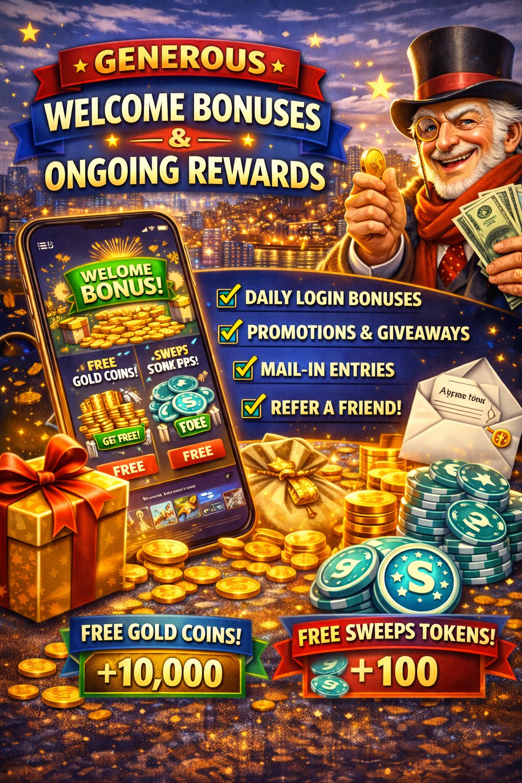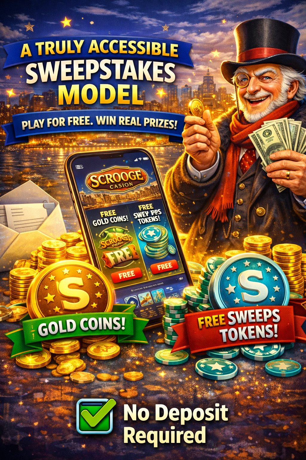 Scrooge Casino has structured its bonus system to reward players from the very first moment they log in. Unlike many sweepstakes casinos that offer modest sign-up incentives, Scrooge hands new users a powerful package of free Gold Coins and Sweeps Tokens just for creating an account — often enough to start winning potential cash prizes immediately.